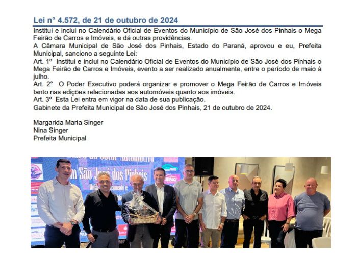 São José dos Pinhais vive um momento marcante para os setores automotivo e imobiliário. A prefeita Nina Singer sancionou o projeto de lei que oficializa os Feirões de Automóveis e Imóveis no Calendário Oficial do Município, consolidando um importante avanço econômico para a cidade.