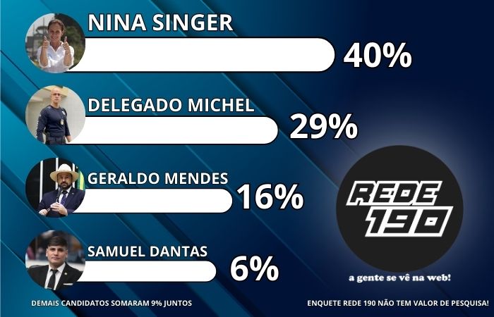 A enquete foi realizada entre o dia 2 e 4 de abril de 2024, nos canais do Rede 190 e teve um total de 1132 participantes, a enquete destacou quatro nomes que despontam como os mais significativos na disputa eleitoral. A atual prefeita, Nina Singer, aparece ligeiramente à frente, com 40% das intenções de voto. Em segundo lugar está o Delegado Michel, com 29%, seguido por Geraldo Mendes, com 16%. Samuel Dantas aparece com 6% das preferências, enquanto os demais candidatos somam 9%.